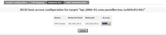 在系統(tǒng)菜單“System”菜單下的“Network Access Configuration”區(qū)域,配置允許訪問 Openfiler 系統(tǒng)的安全訪問控制列表。值得注意的是只有加入到 Openfiler 的網(wǎng)絡(luò)訪問控制列表中的網(wǎng)絡(luò)或者主機(jī)地址,才允許訪問 Openfiler 系統(tǒng)所提供的虛擬存儲服務(wù)。在網(wǎng)絡(luò)訪問控制列表中,既可以配置網(wǎng)段地址也可以配置單個主機(jī)地址。在本例填入 192.168.130.0 網(wǎng)段,設(shè)置類型為“Share”方式,添加完成后點(diǎn)擊“Update”完成系統(tǒng)配置更新。如圖