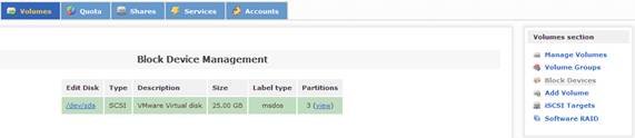 當(dāng)配置好系統(tǒng)的安全訪問控制后,接下來的一步是配置系統(tǒng)磁盤,實(shí)現(xiàn)虛擬存儲服務(wù)。在 Openfiler 中,有三類存儲概念:Block Device,Physical Volume 和 Volume Group。其中,Block Device 表示的是實(shí)際的物理磁盤;Physical Volume 表示的是物理磁盤的分區(qū),它是組成 Volume Group 的單元;Volume Group 則是由一個或多個物理磁盤分區(qū)(Physical Volume)組成,它又是組成 Logical Volume 的單元。