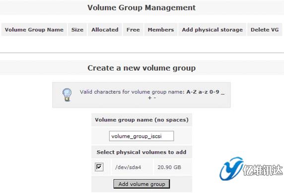 接著在右側(cè)的“Volumes section”區(qū)域選擇“Volume Groups”來創(chuàng)建一個卷組。在區(qū)域“Create a new volume group”處填寫卷組 volume group 的名稱為“volume_group_iscsi”,同時勾選剛剛在上一步所創(chuàng)建的物理卷 /dev/sda4,最后點(diǎn)擊“Add volume group”。如圖