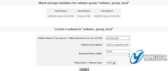 接下來在右側(cè)的“Volumes section”區(qū)域選擇“Add Volume”選項(xiàng),在剛剛創(chuàng)建好的卷組“volume_group_iscsi”中新創(chuàng)建一個 iSCSI 卷。注意在屬性“Filesystem / Volume type”中設(shè)置屬性值為“iSCSI”。如圖 25 所示。