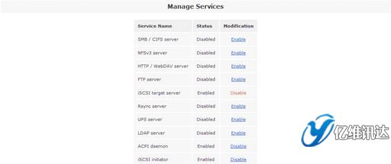 當(dāng) iSCSI 卷創(chuàng)建完成后,接下來是開啟“iSCSI target server”系統(tǒng)服務(wù)。點(diǎn)擊“Services”菜單,在右側(cè)的“Services section”區(qū)域選擇“Manage Services”。然后將系統(tǒng)服務(wù)列表中的“iSCSI target server”設(shè)置為“Enabled”狀態(tài),從而使得系統(tǒng)能夠?qū)ν馓峁┗?iSCSI 協(xié)議的虛擬存儲服務(wù)。如圖