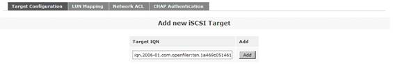 接下來是添加一個 iSCSI Target。首先點(diǎn)擊菜單“Volumes”,然后在右側(cè)的“Volumes section”區(qū)域中選擇“iSCSI Targets”。在“Target Configuration”子菜單中的“Add new iSCSI Target”區(qū)域,選擇列出的“Target IQN”。最后點(diǎn)擊“Add”按鈕,從而添加了一個 iSCSI Target。注意,此處的 Target IQN 信息在后面的對 ESX 服務(wù)器的存儲配置過程中會用到。如圖