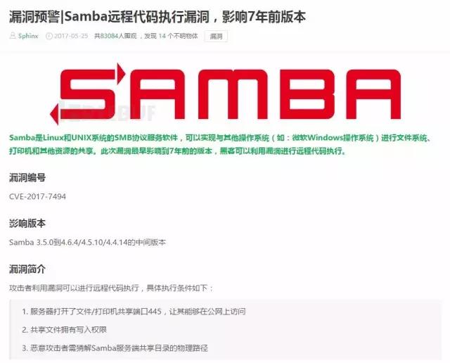 【群暉快報(bào)】2017年5月24日Samba發(fā)布了4.6.4版本,修復(fù)了一個(gè)嚴(yán)重的遠(yuǎn)程代碼執(zhí)行漏洞,漏洞編號(hào)CVE-2017-7494。該安全漏洞可以讓一個(gè)有權(quán)限的用戶(hù)提權(quán)至Samba所在服務(wù)器的root權(quán)限,進(jìn)而執(zhí)行惡意程序,向該服務(wù)器發(fā)動(dòng)攻擊。